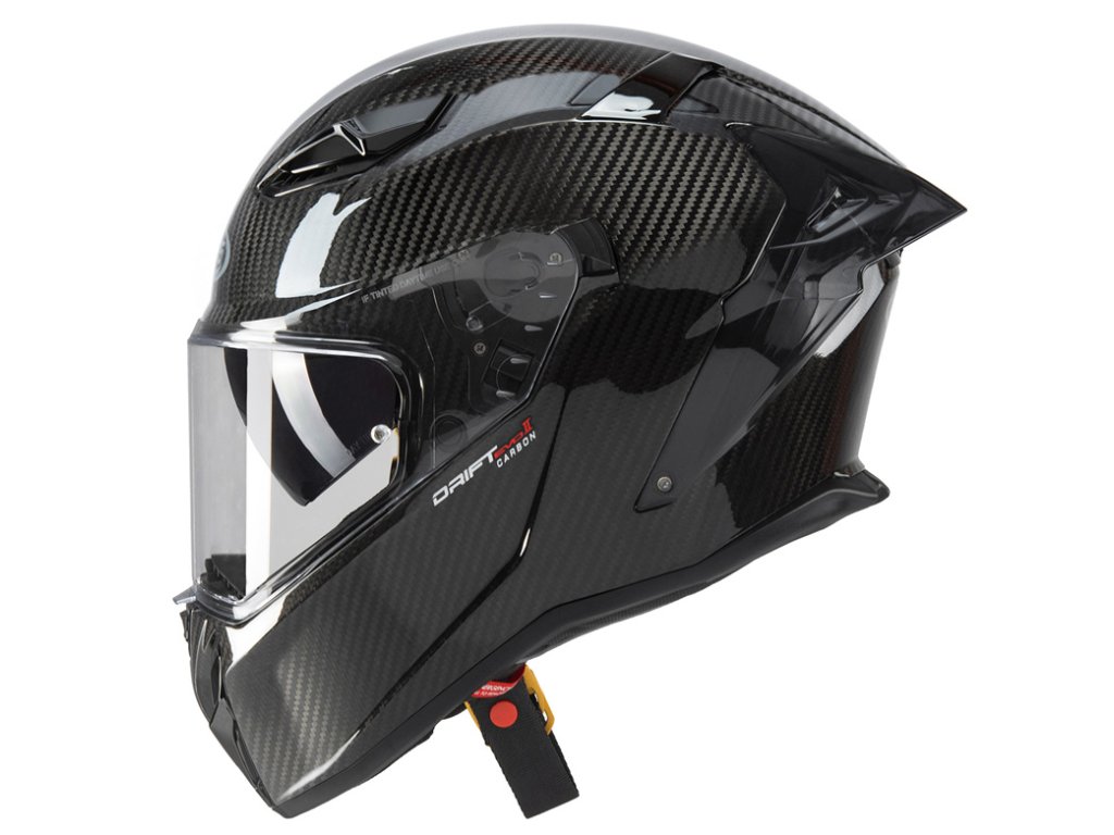 Vonkajšia škrupina sa vyrába v dvoch veľkostiach (malá od XS do M, veľká od L do XXL). Lícnice sú vybavené rýchloupínacím systémom, ktorý umožňuje ľahké a bezpečné sňatie aj v prípade núdze, keď je prilba stále nasadená. A to jednoduchým zatiahnutím za červené pásky. Lícnice sú navyše ergonomicky tvarované tak, aby umožňovali nasadenie okuliarov. Systém zapínania bradového pásika je vybavený dvojitým D krúžkom. Integrálka Caberg DRIFT EVO II je pripravená pre komunikačný systém Caberg Pro Speak Evo. Pre zaistenie maximálnej bezpečnosti prešla táto helma všetkými testami ECE 22.06 aj s nainštalovaným systémom Caberg Pro Speak EVO.
