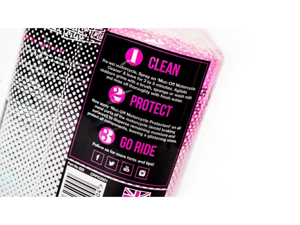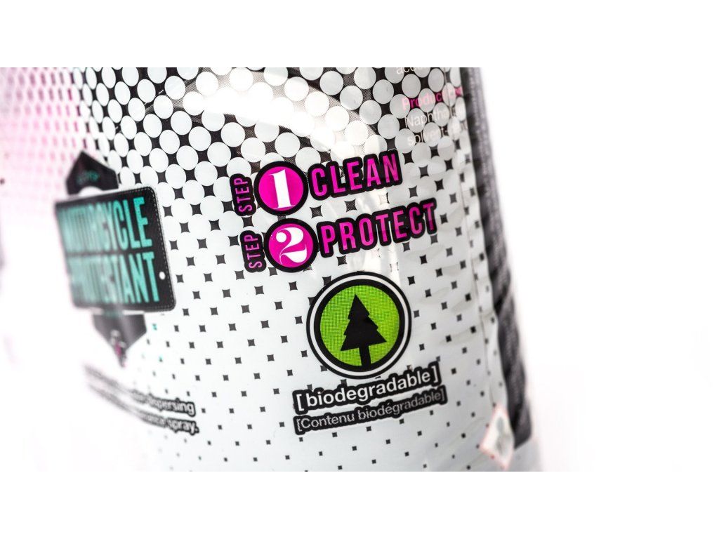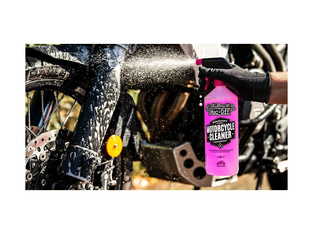 Muc-Off Nano Tech Bike Cleaner - jeho jedinečné Muc-Off Nano Tech čistiace zloženie výrazne uľahčuje prácu bez ohľadu na počasie alebo ročné obdobie. Vďaka "Nano Tech" zloženiu má neuveriteľný čistiaci efekt, dokáže súčasne chrániť aj veľmi citlivé a náchylné povrchy, ako je carbon, elox alebo chróm. Neobsahuje škodlivé kyseliny, CFC alebo rozpúšťadlá, je netoxický a úplne biologicky odbúrateľný. Prípravok preniká rýchlo nečistotami, olejom a špinou a zanecháva bezpečne celý motocykel žiarivo čistý.