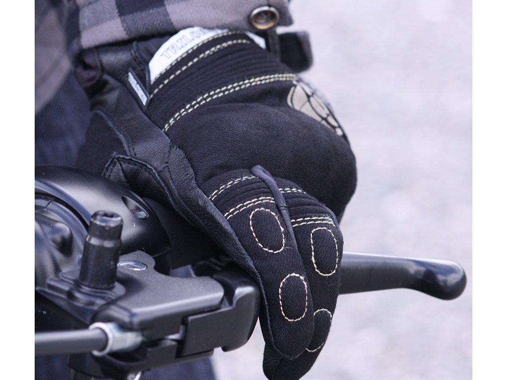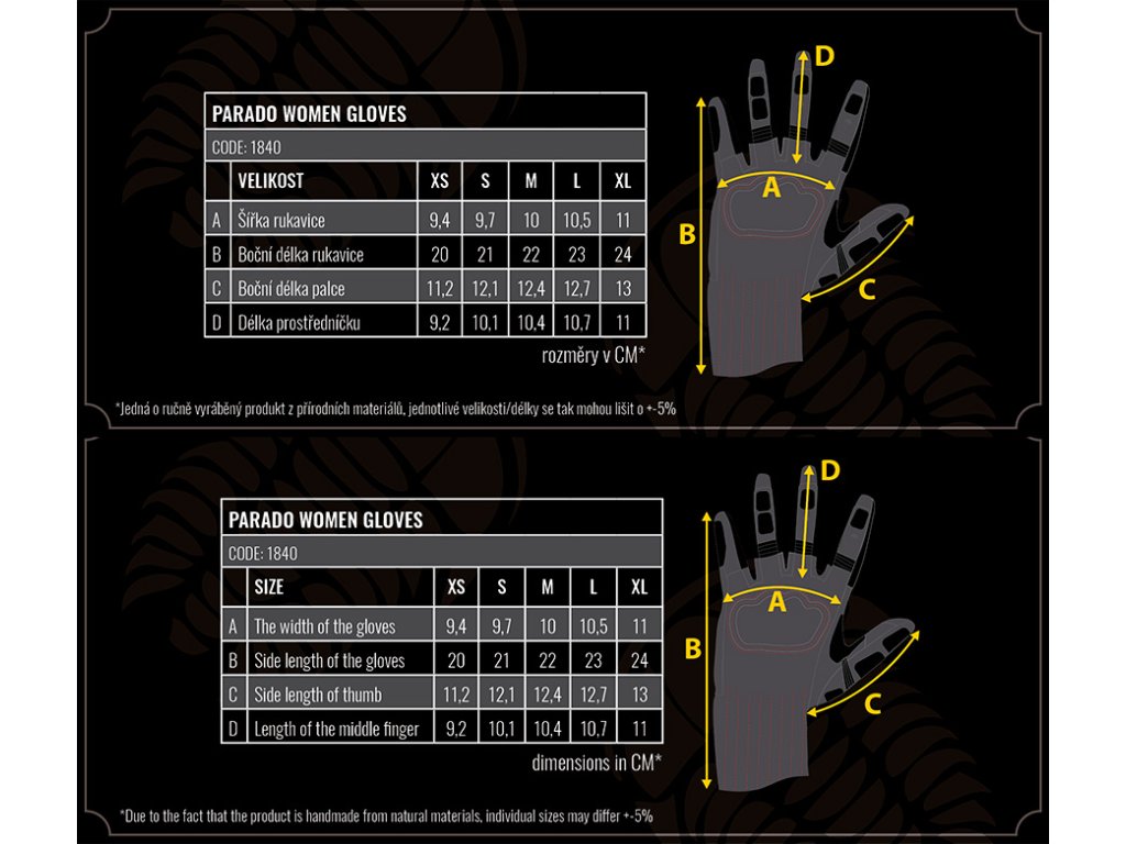 Získajte ten správny úchop a presný kontakt s riadidlami vášho stroja vďaka rukaviciam Parado. Sú navrhnuté tak, aby sa dopĺňali s obľúbenými nohavicami a bundami Parado vo všetkých ohľadoch. Vo funkčnosti, bezpečnosti a pohodlí. Vrchná časť je zhotovená z džínsoviny, dlaňová časť z kože. Rukavice sú celé podšité aramidovými vláknami vyrobenými z originálneho materiálu Kevlar® firmou DuPont™, ktorý zaručí maximálnu odolnosť proti oderu. Malíček a prstenník sú vyrobené z kože a opatrené chráničmi. Všetky kĺby a nárazové zóny sú chránené kombináciou mäkkých a tvrdých chráničov. Množstvo a správne rozmiestnenie strečových panelov zaistí veľkú mieru pohodlia. Reflexný prúžok s logom Trilobite na chrbte rukavice pomáha zvýšiť viditeľnosť jazdca na ceste. Konce prstov sú vyrobené z vodivého materiálu, vďaka ktorému jazdec môže ľahko ovládať mobilný telefón alebo GPS bez toho, aby musel rukavice zložiť. Manžeta na zápästie je vyrobená z pružného neoprénu s opaskom na suchý zips, ktorým rukavicu zafixujete do ideálnej pozície. Rukavice Parado sú certifikované podľa normy CE EN 13-594:2015 a spĺňajú najvyšší bezpečnostný štandard.