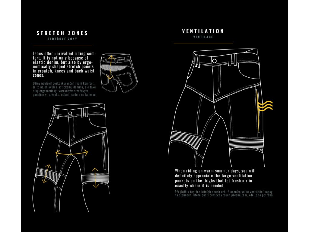 • Zóny dopadu sú vystužené druhou vrstvou TRI-STRETCHER® PRO 5.0 DENIM